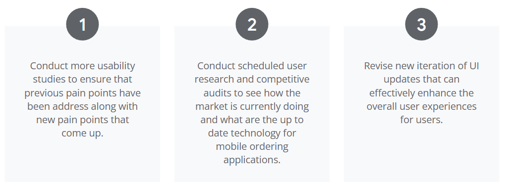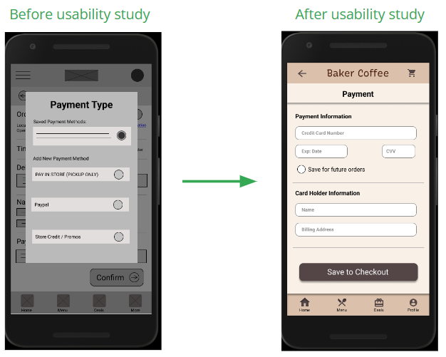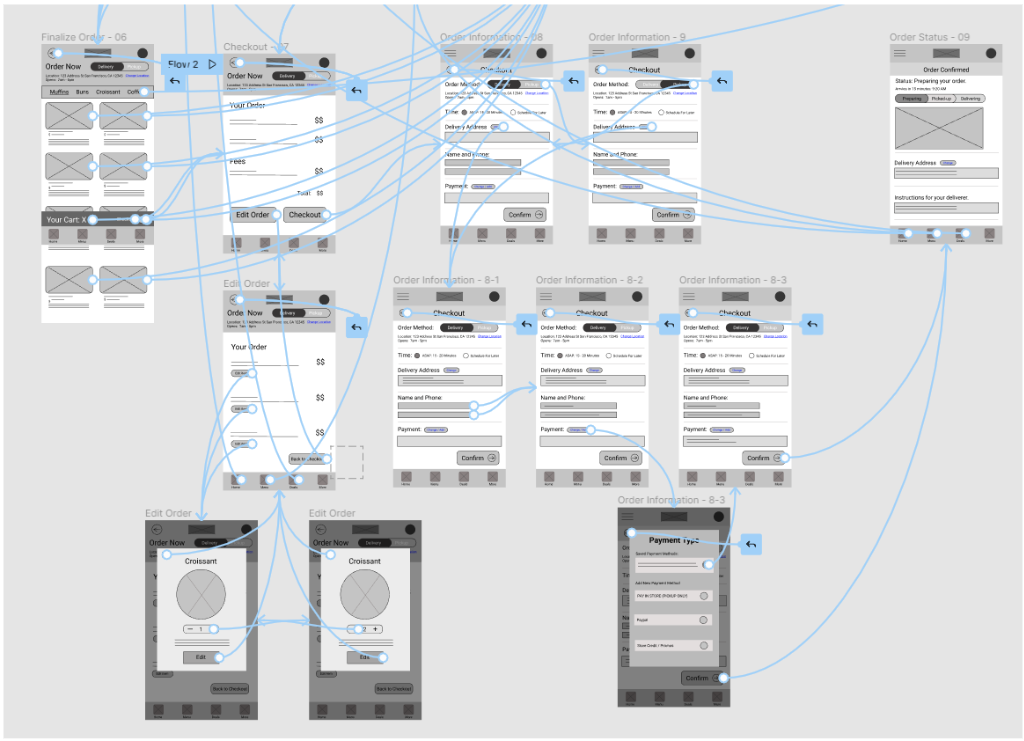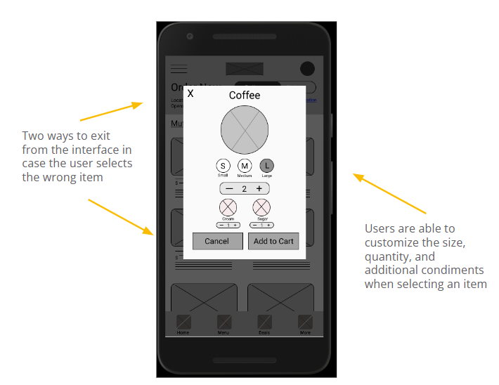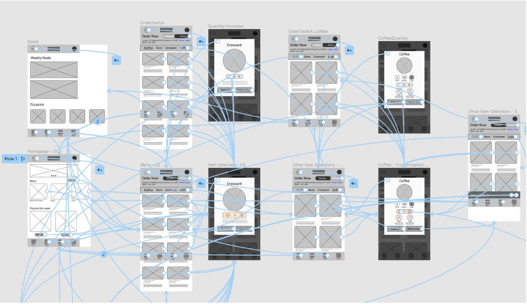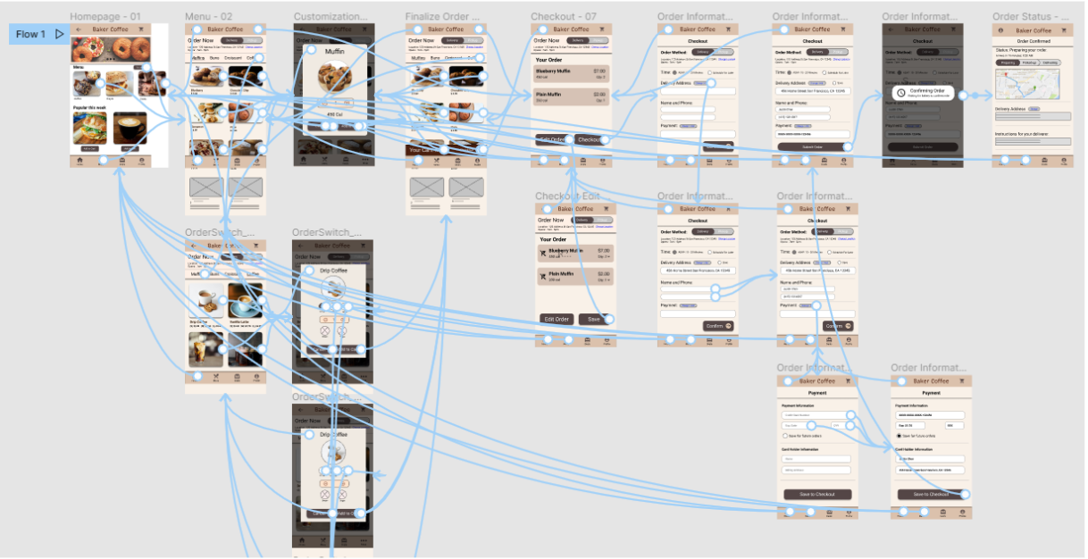 The high-fidelity prototype presents a more cleaner user flow for adding and customizing items to carts. Checkout and payment have also been iterated for a more efficient and cleaner user flow.