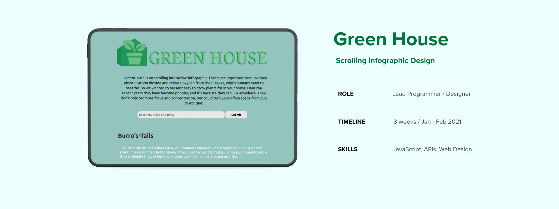 GreenHouse is a website designed to introduce users to indoor plant cultivation through a calm, organic browsing experience. Inspired by the growing popularity of houseplants during the pandemic, each section focuses on a specific houseplant, using smooth scrolling instead of constant clicking to create a fluid interaction. Overall, GreenHouse aims to provide an intuitive and visually soothing way for beginners to learn and care for houseplants.