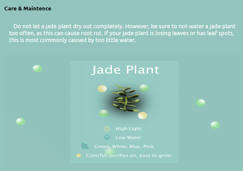 As users scroll, text gradually appears alongside 3D plant models that move and turn in sync with the cursor, creating an engaging and fluid experience. Hovering over models triggers animations, and transparent information boxes display icons representing each plant’s sunlight, water needs, colors, and special features. This interactive design allows users to explore and learn about plants in a visually dynamic and intuitive way.